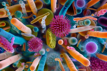 Colorful assortment of bacteria and microbes displaying diversity in form and function in a microscopic environment under exploration.