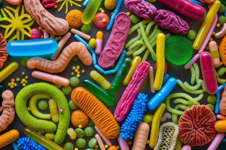 Colorful microbes display diverse shapes and textures, showing their intricate forms in a vibrant environment.