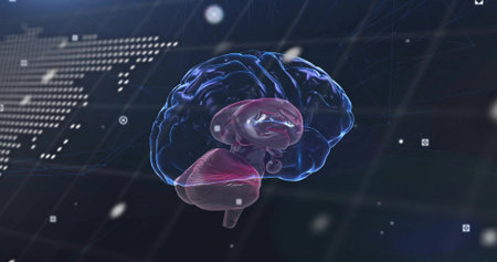 Floating 3D brain model showing cerebellum lobes at digital grid, with data nodes and map overlay. Futuristic, technology, neuroscience, visualization, digital, innovation, neural network