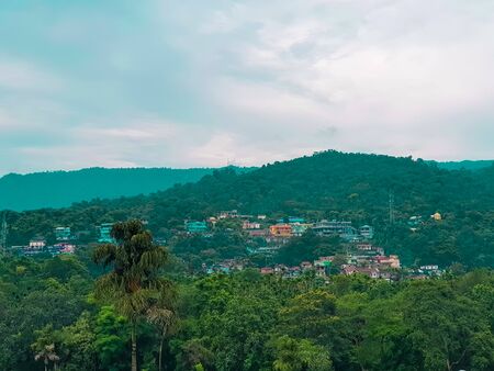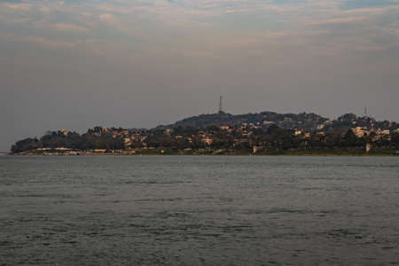 city urban view at morning form flat anlge image is taken at peacock island guwahati assam india. it is showing the serene beauty of nature at dusk.