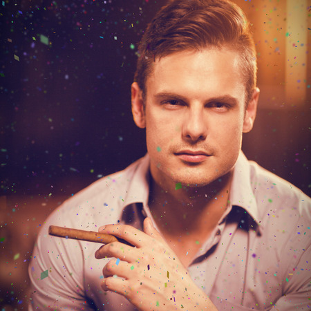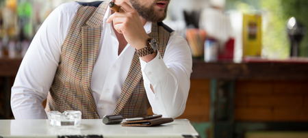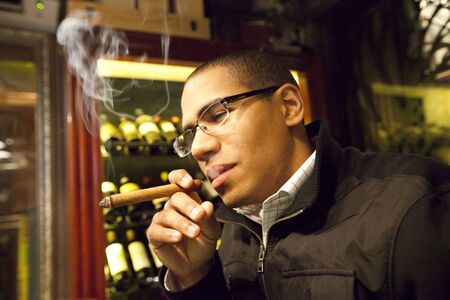 portrait of hansome man smoking cigar in a lounge bar