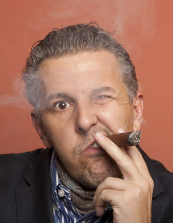 Portrait of a gangster smoking a cigar on a red background