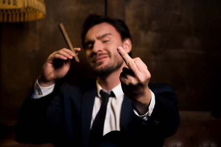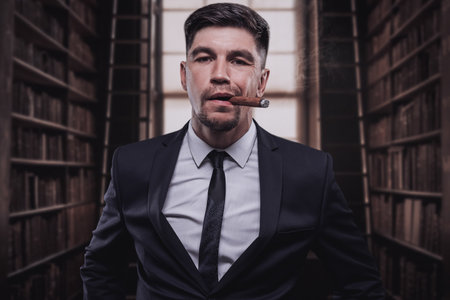 Man wearing suit gangster style smoking cigar
