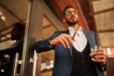 Handsome well-dressed arabian man with glass of whiskey and cigar posed at pub.