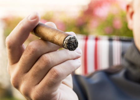 Detail of the hand of a smoking man holding a burning cigar in a garden with a blurred background