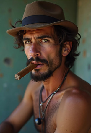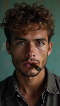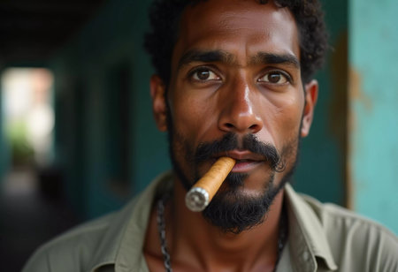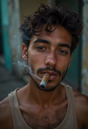 A young man from Cuba confidently smokes a cigar, embodying the rich cultural heritage of the region. His relaxed expression reflects the laid-back lifestyle typical of the area. Generative AI.