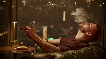 Brutal man smokes cigar. Media. Attractive man with beard smokes cigar coolly. Cinematic cigar smoking with brutal man in restaurant