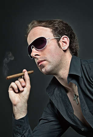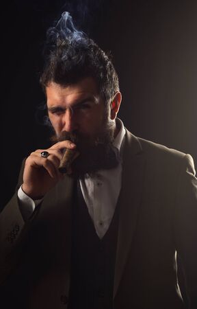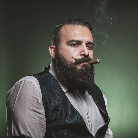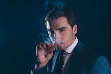 Portrait of handsome man with serious face smoking cigar. Mafia boss.