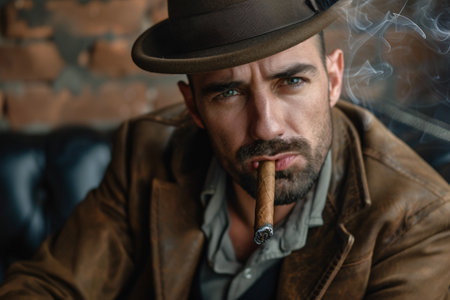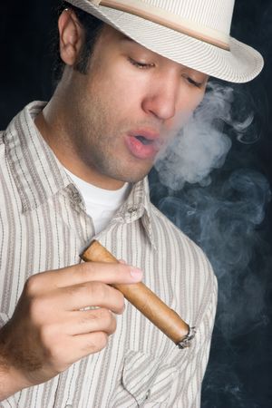 Handsome man in hat smoking a cigar
