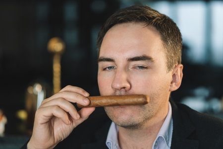 Stylish man sniffing a cigar. Businessman sitting enjoys the smell in the smoking room.