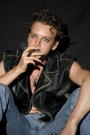 Portrait of handsome man with a cigar in leather jacket posing in a dark room