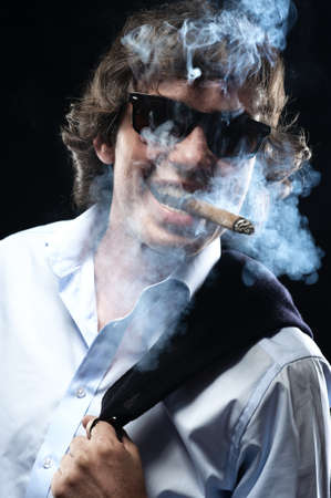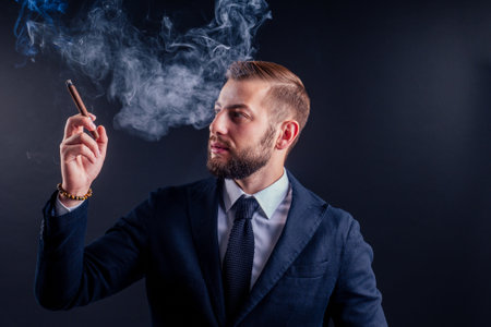 Portrait of an attractive business man with a cigar in black background studio