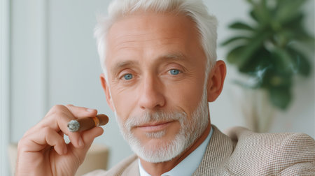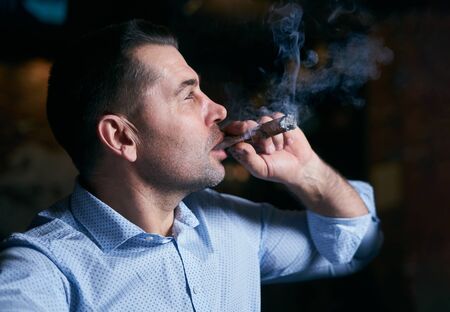 Close up portrait of brutal grey haired mature man looking away while smoking cigar