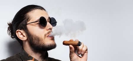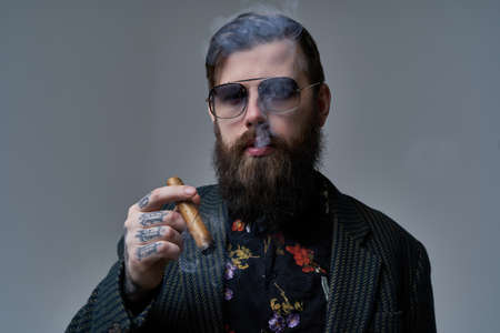Portrait of a serious and handsome man with stylish coiffure posing in gray background. Tattooed man smoking cigar.