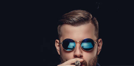 Portrait of bearded man in sunglasses. A man smoking cigare. Isolated on black background.
