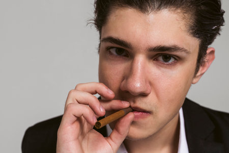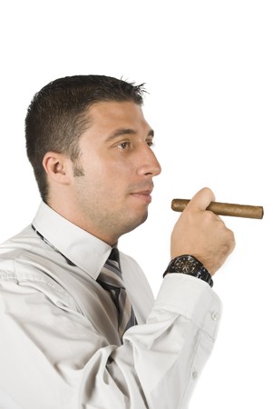 Close-up portrait of young man with a cigar on white background.