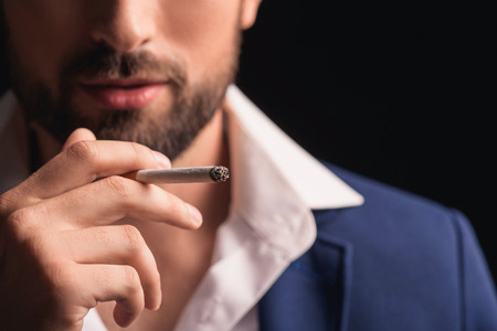 Cropped view of mafioso holding cigar on dark blue background