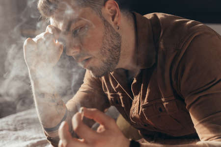 Man blows smoke while smoking marijuana hand rolled cigarette and sitting