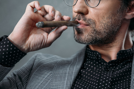 cropped shot of confident businessman in eyeglasses smoking cigar