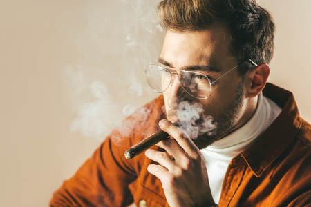 portrait of fashionable pensive man smoking cigar and looking away isolated on beige