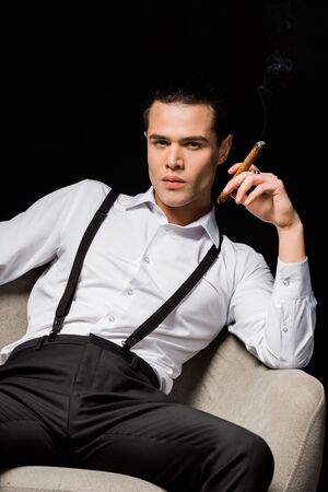 Handsome man holding cigar while sitting in armchair isolated on black background