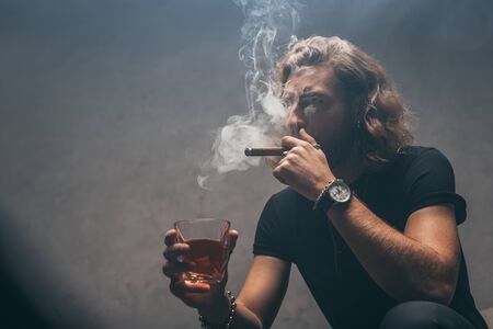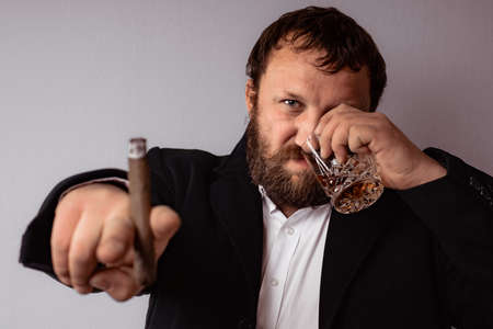 Bearded man in modern coat and shirt smoking his cigar and drink some strong liquor toast and celebrating.
