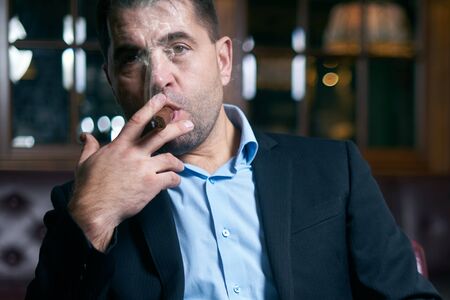 Portrait of a handsome courageous man sitting pensive in a rich setting on a leather sofa and smoking a cigar. Luxurious lifestyle. Retro style. Mafia and criminal world, detective.