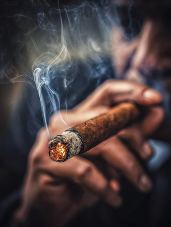 A moody, intimate shot captures a hand clutching an expertly crafted cigar, its ember softly glowing while tendrils of smoke curl into the shadowy atmosphere.