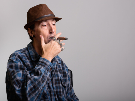 Studio shot of mature gangster man smoking cigar