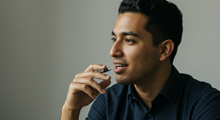 A reflective moment captured in an outdoor setting, with a man holding a pen and looking into the distance