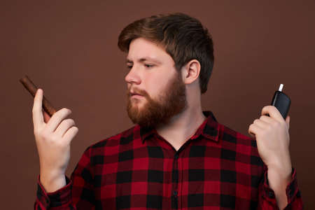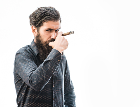 Man with beard holds cigar on grey background