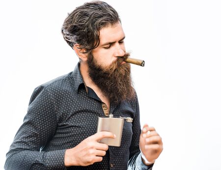 handsome bearded fashion man with stylish hair mustache and beard on serious face holding metal flask and cigar isolated on white