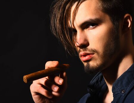 handsome bearded man in blue shirt with stylish hair on serious face holding cigar in black studio background
