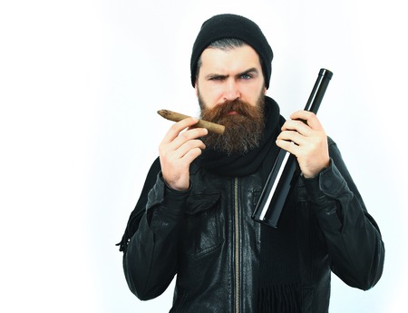Bearded man, long beard. Brutal caucasian serious unshaven hipster holding bottle and smoking cigar in black leather jacket, hat and scarf isolated on white studio background, copy space