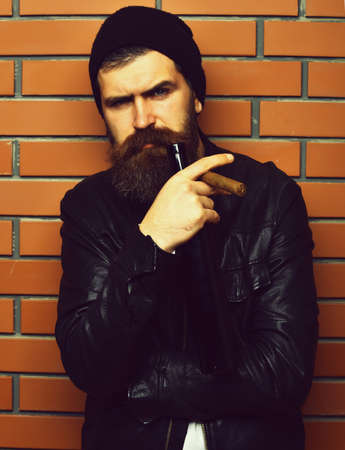 caucasian serious unshaven hipster smoking cigar with black leather jacket, hat and white shirt on battered wall background, copy space
