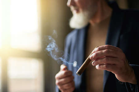 Close up shot of hands of elegant bearded mature man holding cigar while standing indoors