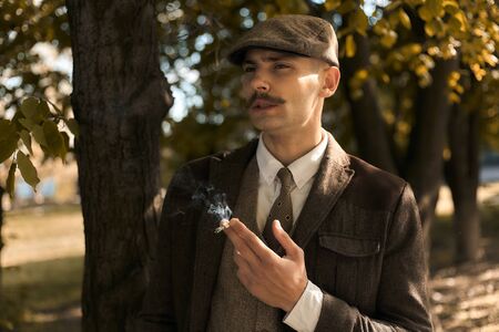 Retro 1920s portrait of an English gangster with a flat cap. Smokes a cigarette on the street..
