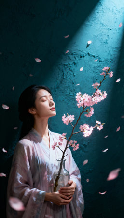 Woman dressed in traditional clothing holds a cherry blossom branch in a glass vase under a spotlight. Falling petals and textured teal background create a serene atmosphere.