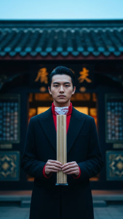 A striking vertical, full-body stock image capturing the quiet anticipation before the Chinese New Y