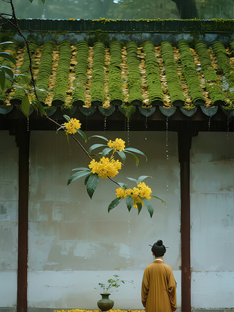 Buddhist monk with yellow flowers in front of the temple.