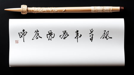 Calligraphy brush resting beside scroll featuring traditional Chinese characters. Black background enhances elegant artwork. Concept of art, culture, education.