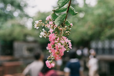 Pink Crape Myrtle Flowers Hanging on Branch with Green Leaves and Blurred Background of People Walking