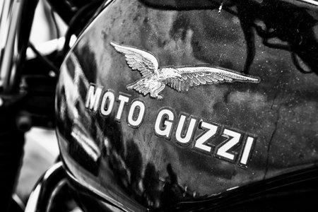 BERLIN - MAY 11 Fuel tank Italian motorcycle Moto Guzzi, black and white , 26th Oldtimer-Tage Berlin-Brandenburg, May 11, 2013 Berlin, Germany