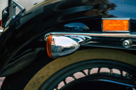 Seville Spain July 12, 2021 Closeup of the mechanics of a motorcycle parked in a parking lot located in the city center of Seville, an emblematic city and the capital of the region of Andalusia, in the south of Spain