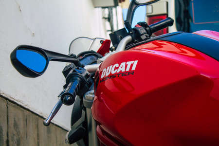 Limassol Cyprus June 26, 2020 Closeup of a Ducati motorcycle parked in the streets of Limassol in Cyprus Island