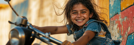 Girl on a Bike. Happy smiling preteen girl on a bicycle, outdoor, at sunset.