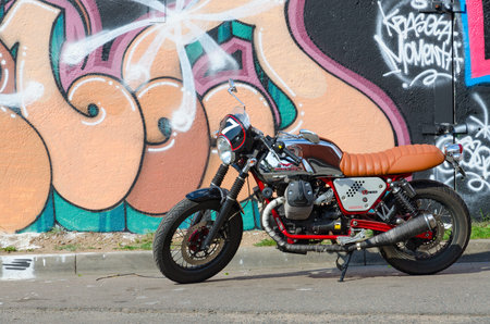 MINSK, BELARUS - AUGUST 12, 2019: Street art on Oktyabrskaya street. Graffiti on concrete fence. Motorcycle Moto Guzzi