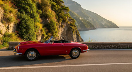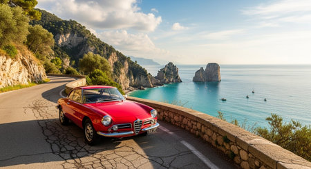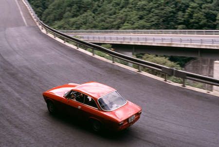 Modified Alfa Romeo 156 seen on the road driving on a warm sunny day. Mountains and sky in the distance. Part of Croatian italian car enthusiast group