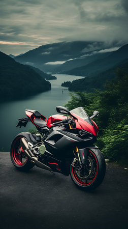 Beautiful view of a mountain lake with a motorcycle in the foreground