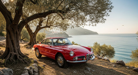 Italian sport sedan Alfa Romeo Giulia seen from the side in a desert setting. Real outdoor scene showcasing beauty, power, and timeless automotive aesthetics.